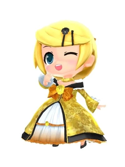 Rin's Outfit is based off the character Riliane Lucifen d'Autriche from "The Daughter of Evil Series", who in turn is based off of Rin herself. It consists of a luxorious dark yellow gown with floral pattern designs, a black rim with white frills, additional frills on the sleeves, a dark yellow choker, an orange bow on the chest with the same designs as the gown and a yellow corsage on the center. There is also additional white layers to gown that are exposed in the center of the gown and have orange frills on the trims with a small, yellow corsage in the center of the first orange frill and black high heels. Additionally, Rin wears her hair in a ponytail that is held with a orange bow with black trims, and her bangs her held with a two black hairpins with a black corsage adorned on the left pin.