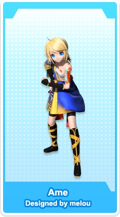 In Hatsune Miku: Project DIVA X, Ame can be randomly unlocked by clearing the Chance Time on any song in Cloud Requests and fully clearing the song. It is attributed with the Aura Elegant, gives a +20% Voltage bonus when used in a song attributed with the same Aura, and its gameplay effect is "Rate Up Lv. 2". In Hatsune Miku: Project DIVA Future Tone, it is included in the Future Sound song pack and can be bought for 450 VP. It is also featured in Hatsune Miku: Project DIVA MegaMix+. It would also be included in the original Project DIVA MegaMix where it is featured in the Song Pack 17 DLC. Its appearance was modified in the latter to include the ToonShader graphics.
