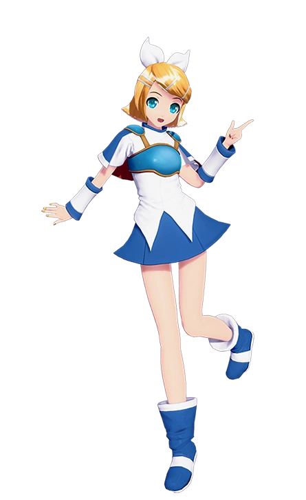 Rin's Module is based on the character Arle Nadja from the Puyo Puyo series, specifically her design from Puyo Puyo! 20th Anniversary onwards. It consists of a white T-shirt with double-V cuts on the front, an egg blue breastplate held with a gold rim with matching shoulder plates connected on, a cobalt blue cape with a white rim and red-orange inner fabric, long white wristbands with cobalt blue rims, a cobalt blue skirt, and boots with white cuffs, straps, and soles. Her iconic white headband and hair clips remain in her hair. Additionally, her hairstyle is similar to that of Arle's, with a shoulder-length bob cut and the character's signature ponytail with Rin's bow attached to the hairband.