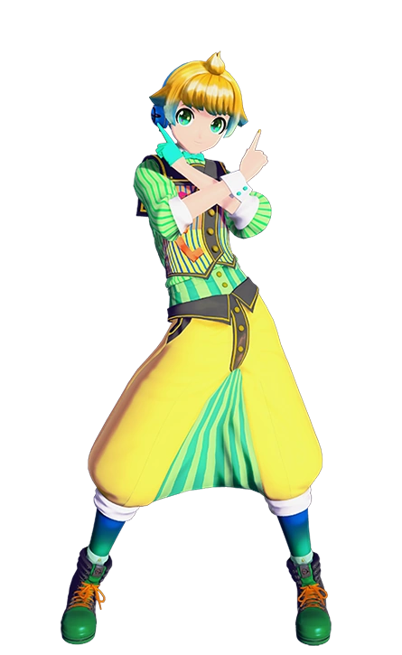 The Module's attire consists of blue headphones, a yellow vest with blue stripes, a pink odd-shaped pin and an orange "L" pin, and a black collar, a green collared shirt with darker stripes and white cuffs, a turquoise bowtie, a turquoise glove on the left hand, a white cuff with turquoise cufflinks on the right wrist, a green striped undershirt, yellow pants with a black collar-like hem and green striped fabric stitched between the legs, blue and green stockings, light-green socks, and black and green shoes with orange laces. Additionally, Len's hair features blue hues, his bangs are noticeably shorter, parting to the left, has tufts of hair sticking out on top of and on the sides of his head, his eyes become greenish-blue with tiny stars on the irises.