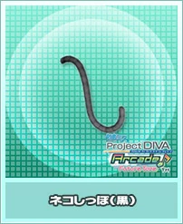 Black Cat Tail was featured once again in Hatsune Miku: Project DIVA X where it can be obtained as a random drop after clearing a song in Cloud Requests. It is attributed with the Aura Elegant and gives a +5% Voltage bonus when used in a song attributed with the same Aura. It will also give various Voltage bonuses when paired with other specific Accessories: