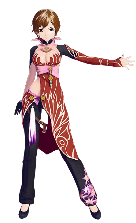 The Module's attire consists of a red dress with white flame designs with exposed openings on the left torso and on the back, gold orbs that are connected with a brown string with an attaching lavender tassel, a matching detachable sleeve on the left arm, black skin-tight detachable sleeves with a neck, a light-pink frontless shirt with an extended petal-like collar and a brown crest and gold emblem on the bottom of the collar, pink sarashi bands tied around the waist with a gold orb that hangs a gold diamond with two small blue jewels hanging off the diamond, a black glove on the right hand, black pants with a lavender waistband and flowers on the left leg, a brown belt that is hanging off the right leg, and black high-heels.