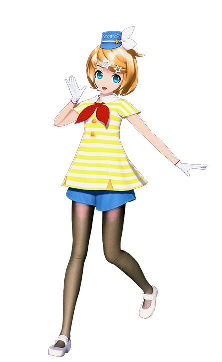 The Module's attire consists of a white speaker with an attached mic on the right ear, a blue attendant's cap with a white stripe and a gold star at the base, a yellow and white horizontally striped short-sleeved shirt with a white collar, a red ascot acting as a bowtie, yellow buttons on the center chest area, and two small triangular-cuts on the front sides, revealing a dark yellow fabric, white gloves with red edge trimmings on the cuffs, short blue shorts, dark leggings, and white Mary-Jane's. Additionally, the lower strands of Rin's hair are parted inward, has a cowlick on the right side of her head, and her bangs are held with two white star-shaped hairpins.