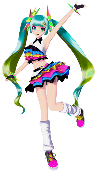 This Module consists of Miku wearing a black collared white cropped top with large colourful (black, cerulean, yellow and hot pink) frills spilling out from the left hand side and a matching white and black skirt with more colourful frills spilling from her right hip. She also wears grey fingerless gloves with a spikes rainbow colored bracelet which is a similar design to her two hair ties which replaces her signature black and red square like ties. Her hair and eyes are still turquoise but with a slightly lighter shade and with the hair large streaks of neon green in her twintails, her bangs are also cut to a fringe, and to finish it off, she has a yellow clip in a shape of a 'C' with an arctic blue center. There are also long white loose socks and black and hot pink sneakers with yellow laces with small multicoloured balls inside the soles. Additionally, Miku wears hot pink eyeshadow and two painted hearts on her face, with the left one on her cheek a tiny hot pink and on the top right a small cerulean.