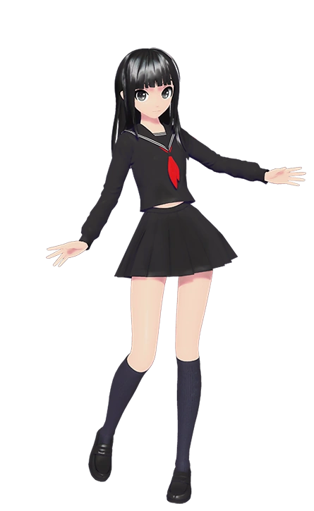 The Module's attire consists of a jet black school uniform, which includes a blouse with white trimmings and a purple cat design on the back, a red scarf, a jet black skirt, black leg-length socks, and jet black loafers. Additionally, Miku's hair becomes jet black with a portion resting on her left shoulder like Megurine Luka and a short portion on the right, her bangs are horizontally cut, and her eyes become dark grey. She never wears nail polish.