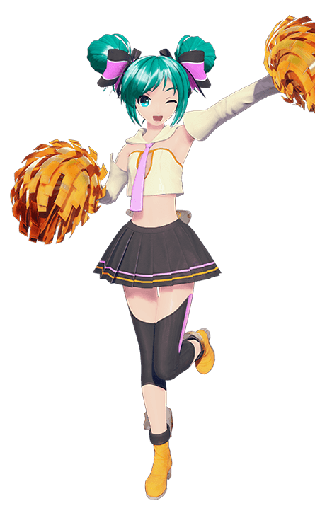 Miku's Module is based off the outfit featured on Good Smile Company's "Hatsune Miku Cheerful Ver." figurine released in 2011. It consists of a light-yellow crop top with orange trimmings and see-through fabric in the center chest area, a light-yellow detachable hood-like collar, a light-purple tie, light-yellow detachable sleeves, a black skirt with small light-purple and orange stripes, orange see-through fabric connected to the back of the skirt, black, diagonally-cut spandex that cover from the thighs to the upper calves with light-purple stripes on sides, orange boots with white circles featuring orange hearts, black cuffs, and orange see-through soles, and see-through material connected to the back of the cuffs. Additionally, some of her bangs are parted to the right.