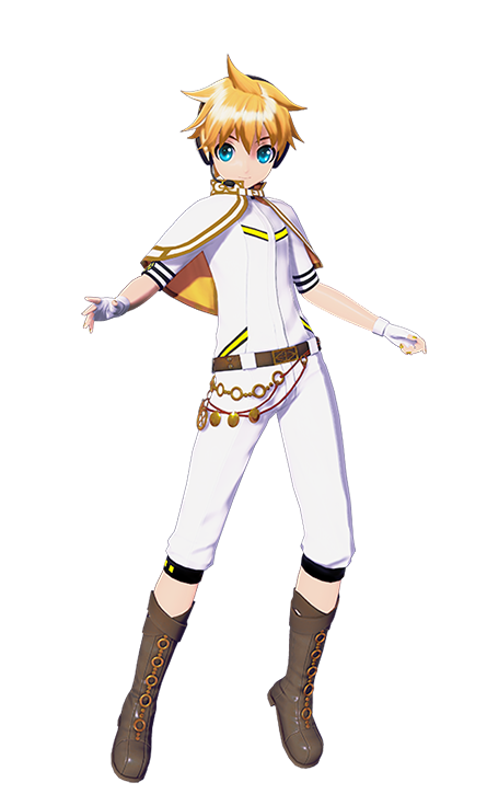 The Module's attire consists of black oval-shaped headphones with white lines on the earpads and a yellow striped illumination on the attached mic, a white short-sleeved bodysuit with short black and yellow stripes on the top section, black and white stripes on the cuffs, and black hems on the legs, white fingerless gloves with black and yellow square designs, a brown waist belt with gold belt chains with round ornaments, a white collared cape with gold linings and yellow inner fabric, and brown boots with gold buckles. Additionally, Len's hair bunches are slightly shorter.