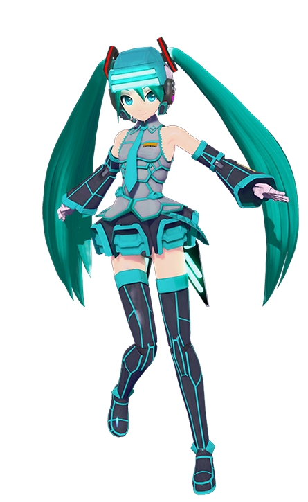 Miku's Module is based off the character SRV-14-A Fei-Yen from Cyber Troopers Virtual-On: Operation Moongate . It consists of a more robotic version of Hatsune Miku's default outfit, which includes a turquoise and grey helmet with light blue visors, a metallic-tiled shirt the turquoise trimmings, a more bulky skirt with turquoise flaps, grey flappers connected to the back of the skirt, grey robotic gloves, and a battery pack with a CD running on it.