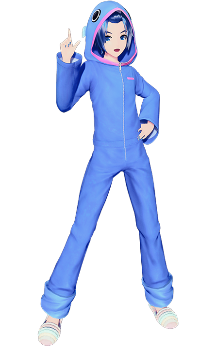 The Module's attire consists of a blue hoodie onesie that includes eyes, a purple hem, and light-blue fins on the hoodie, a purple tag on the left chest, and a gray tag on the neck with the word "DIVA" printed on. There are also white slippers with multicolored stripes. Additionally, KAITO's bangs are held back with a white bow.