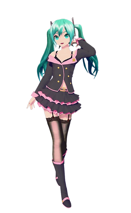 The Module's attire consists of a black long-sleeved crop top with a pink collar, cuffs, and trimmings, a gold crest with the kanji 美 (,Mi?) on the left collar, gold buttons and cufflinks, a black frilled bra, a multilayered black and pink skirt, a pink and black belt with a gold buckle, black stockings with garters, and black boots with pink cuffs, straps, and heels. Additionally, Miku's hair and eyes become light turquoise, her twin-tails shorten and are held with black and pink butterfly hairclips, and her nails become pink.