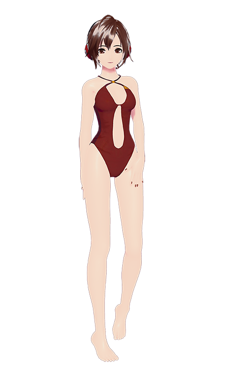 Meiko's mature sexiness is on full display in her revamped swimwear module. Eye-catching in both regular and tanned variations, this maroon one-piece swimsuit plays to all of Meiko's strengths. — Website description[ 1]