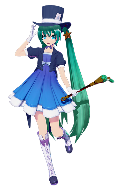 The Module is based off the outfit worn by Miku in the key visual for "Hatsune Miku Magical Mirai 2013". It consists of a dark-blue tailcoat with puffed shoulders and white cuffs, a blue frilled dress with white hems and a light-blue bow tied at the waist, white gloves, matching knee-high boots with purple bows and dark-blue toes, and a large dark-blue top hat with a white center stripe that has a card with a spade on it tucked in, as well as a gold star ornament dangling off the left side. Additionally, her front bangs become thickened and side-swept, the bottom half of her twin tails becomes a light colour and they are held with purple hair bands.