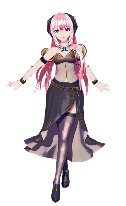 Luka's Module is based off the illustration featured on the package of the "Megurine Luka V4X" voicebank. It is only slightly similar in appearance to her default attire. The differences include her headphones becoming large and black and brown with gold bars on the back pads, her cropped dress becoming a shiny, wooden brown with the fabric below the chest becoming slightly see-through, a detachable collar that has the blue jewel-piece attached to brown ribbons, a woodwind crest and a blue jewel-piece on the left breast plate, black armbands with gold hems and enlarged openings, black and gold wristbands with blue parameters that extend to the elbows, a gold woodwind chain that wraps around the waist, the hem of the skirt includes a gold woodwind-like pattern, brown stockings with black and gold cuffs, and dark brown high-heeled shoes. Additionally, her hair becomes slightly thinner and her eyes and nails gain a subtle purple hue.