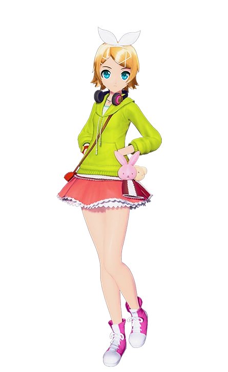 In Project DIVA, it was refined to include other accessories: a brown pochette hanging held on Rin's left shoulder, black headphones with magenta and lime green designs around her neck, a moderate amaranth and lime green wristwatch on her right wrist, added white frills to the skirt, animal accessories (a very pale cerise rabbit and peach bear) attached on with a brick red and white striped ribbon-like belt by the left hip, and a black necklace with a very light raspberry heart charm. Additionally, her hair and bow become slightly shorter, her hair clips form an 'X' on her left bangs, and a large portion of them are tucked into her left hair fringe while a small portion are tucked into her right fringe.