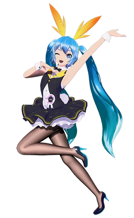 Despite the Module's name, the design is more loosely based off the character Chuni Penguin from the arcade rhythm game "CHUNITHM". It consists of a black, one-piece, tuxedo-like dress with a yellow collar, yellow stripes on the hems, white frills under the fabric, a white pin with pink squares that resembles the arcade cabinet for "maimai", and a white rabbit tail on the back. There is also a white, sleeveless, collared shirt, a black bowtie, white cuffs with black buttons, dark pantyhose, and black high-heels with turquoise heels. Additionally, Miku's hair and eyes become a light-blue, her pupils gain a white twinkle, and she wears yellow headphones with attached yellow and orange rabbit ears that resemble Chuni's hairtuft.