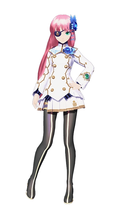 Luka's Module is based off the character Nagisa Adelheid Howzer from Phantasy Star Portable 2 Infinity . It consists of a white military-styled jacket with gold rimmings and buttons, an emblem on the left collar, a blue and gold shoulder pad, and a light blue design on the front and back shoulder lines. There are also green jewel pieces on the end-sleeves and sides of the jacket. She also wears a matching skirt, blue corsages in her hair and on her jacket, a black eyepatch with a gold design covering her right eye, and black stocking boots with gold rimming in the middle and gold soles.