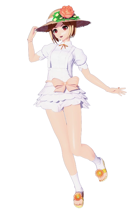 The Module's attire consists of a straw sunhat with a white hem and a salmon pink corsage, a white collared dress with puffed short sleeves with petal-like cuffs, an orange ribbon tied on the collar, white overall shorts with petal-like frills, a light pink bow tied at the waist, open-toed socks, yellow sandals with orange flowers on the straps, a light pink bracelet on the right wrist, and orange nail polish to match the ribbon and the flowers.