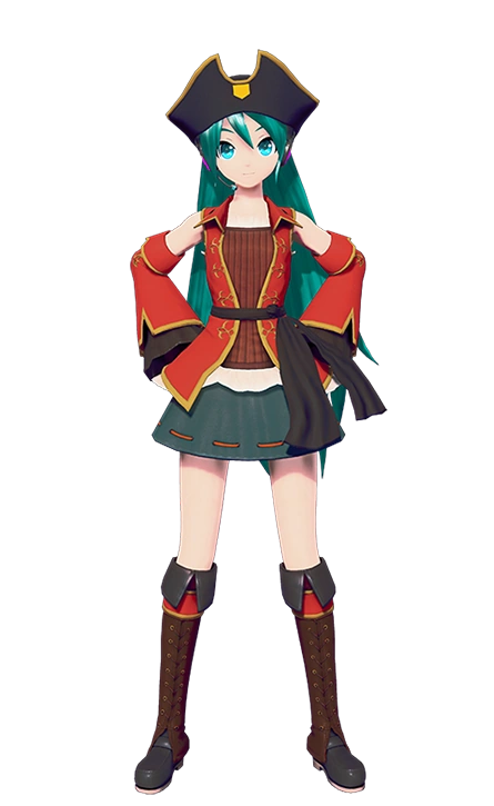 The Module's attire consists of a red pirate jacket with yellow trimmings, matching detachable sleeves with black frills, a reddish-brown shirt with a white frill on the bottom, a black skirt, brown gloves, a black waistband, brown boots with red and yellow stripes on top of them, and a black pirate hat with yellow trimming. Additionally, Miku wears her hair loose.