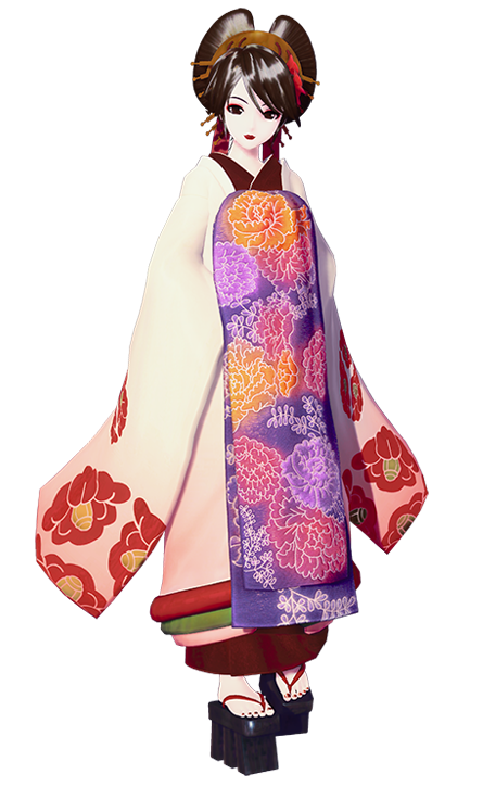 The Module's attire consists of a light pink uchikake kimono with red camellia flower designs on the sleeve flaps, a purple manaita obi belt with red, yellow, and lavender camellia designs, a long red hakama, and long black geta sandals with red straps. Additionally, MEIKO's skin lightens, wears white face painting and red eyeliner and lipstick, her hair is styled with a date hyogo hairstyle common with oirans with a red ribbon tied on the back, and wears a gold "shiroko no sanmai gushi" comb ornament and three red camellia flowers in her left-side hair.