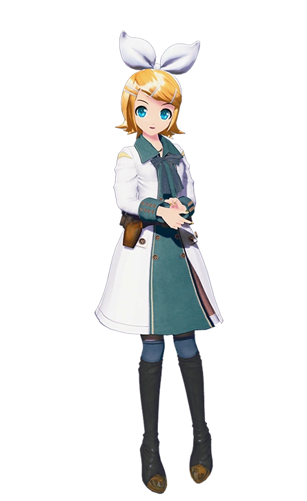 Rin's Module is based off the character Leanne from the video game Resonance of Fate (End of Eternity in the Japanese release). It consists of a white and teal collared coat with yellow shoulder stitching and a teal bow, a necklace, a black belt with a brown gun carriers connected on, a maroon under-dress with white trimming, blue stockings with brown trimming, and black boots with brown tips.