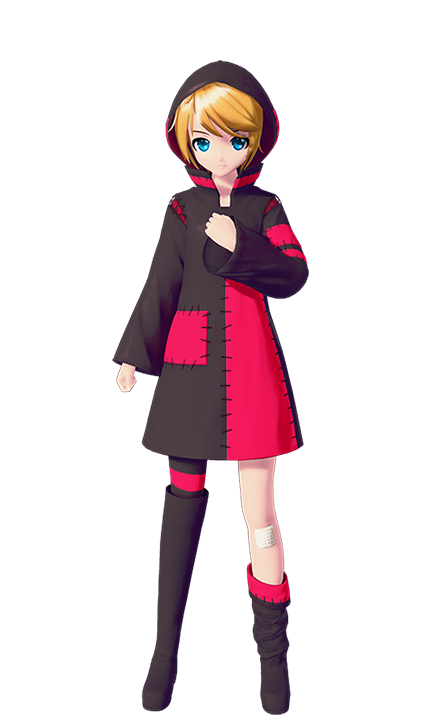 The Module consists of a black hoodie dress with various brilliant amaranth patches stitched throughout. There is also a striped stocking on the right leg, a bandage patch under the left knee, and the boots are mismatched: with the left leg having a short black boot with a brilliant amaranth patch on the cuff, and the right leg having a long black boot.