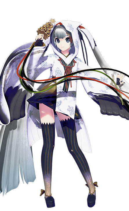 The Module's attire consists of a white kimono with snowflake patterns, black hems with gold stripes, and a red ribbon-like rope, black feather designs on the sleeve flaps resembling a Siberian crane, a matching hoodie with a red mark on the hem, black sleeves, a skirt with lighted hues, stockings with gold stripes and lighted hues, and geta shoes with a gold bow tied on the back. Additionally, Miku's hair becomes white, her twin tails become large on the ends, and she wears white flaps that match her hoodie over her twin tails tied with black ribbons, and black nail polish.