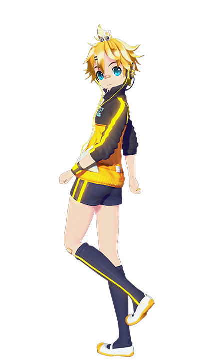 The Module's attire consists of a yellow and black turtleneck jersey with glowing yellow stripes going down the sleeves, which are rolled up to the elbows, a miniature version of Len's tie on the zipper, Len's serial code "02" stitched on the top left in blue, white triangular fabric on the lower sides, a small bass-clef (F-clef) stitching and two small badges on the bottom, a yellow synthesizer line on the back, a small belt with a silver buckle featuring a bass-clef design on the bottom, black headphones stylized as stopwatches with the yellow wire going into the left pocket, a black wristband with glowing yellow square designs on the left wrist, black bloomer shorts with double yellow stripes on the sides and a bass-clef design on the back, a bandage on the left knee, a small bandage on the top of the nose, long black socks with yellow stripes going down the sides, and white indoor shoes with yellow tips. Additionally, the edges of Len's hair have greenish hues, and a lock of his hair is held with a white hairpiece that is stylized as speakers with rabbit ears.