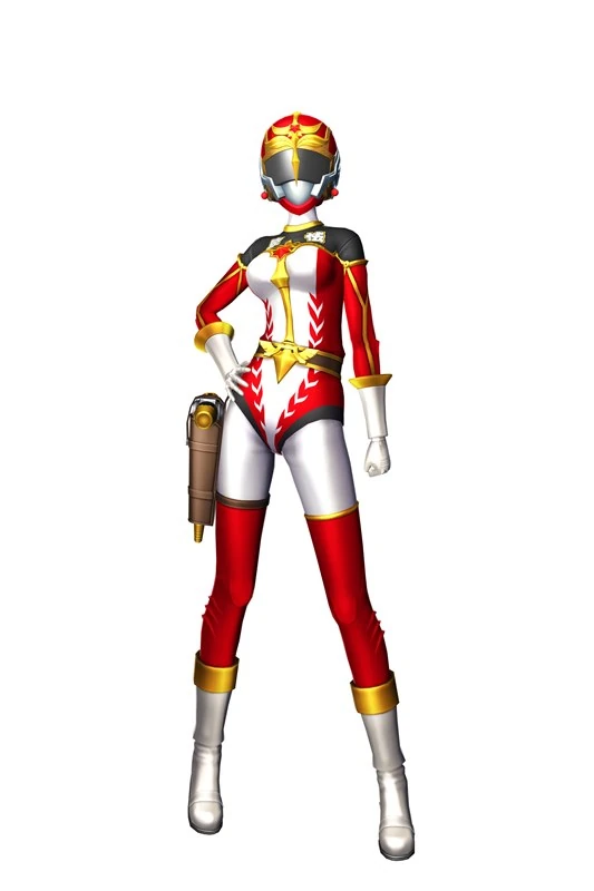 The Module's attire consists of a red jumpsuit with white on the center and black with a gold hems on the chest area with the words 卑怯 ( Hikyō?) written in white and gold, a white neck covering, a red star-ornament embedded on the chest, a brown belt with a gold crest that reaches up to the chest, matching white gloves and boots with gold cuffs, white jumpsuit-pants, red stockings with gold hems, and a brown carrier on the right leg holding a shooting-type weapon. Additionally, MEIKO wears a red helmet with grey pieces on the sides, a gold crest on the top with a red star-ornament embedded, a black visor, and a grey mouth covering.