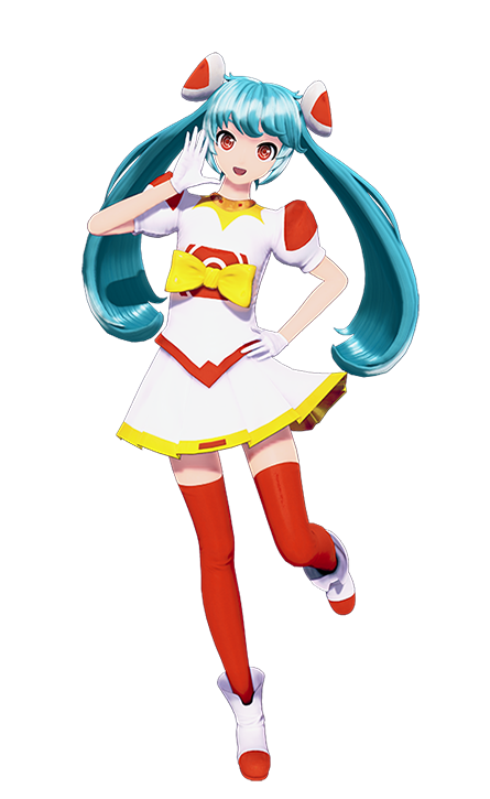 The Module's attire consists of a white space-age dress-shirt with a v-cut on the bottom with red edging, puffed sleeves with red designs, red circle designs on the middle area with the top and bottom cut off, a yellow ribbon, a gold collar, a yellow sun-like design on the neck area, and katakana letters ハツネ (, Hatsune ? ) written on the back in red, white gloves, a white skirt with a yellow hem on the bottom with a small red rectangle on the center, long red stockings, and white boots with red tips. Additionally, Miku's hair becomes sky blue, her bangs shorten, her twin-tails are shorter with the bottom tips curving upwards, her eyes become red, and she has large white ornaments with red designs attached on her hairbands.